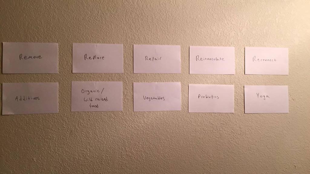 I created a card deck, one for each person that contained a version of the 5R IBD Healing Framework.
