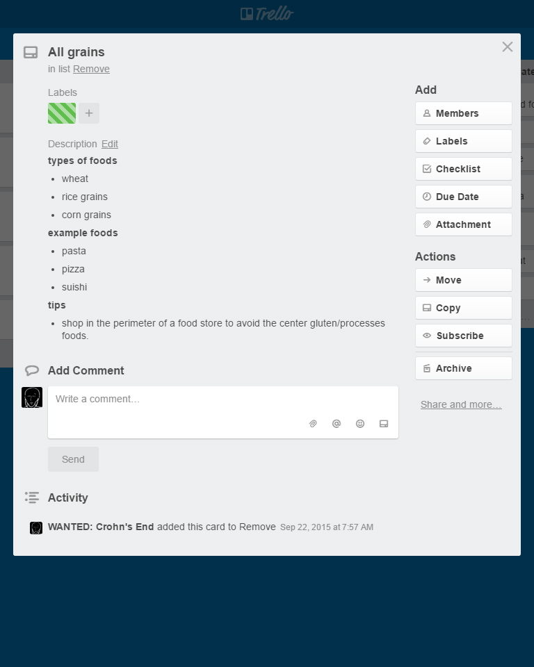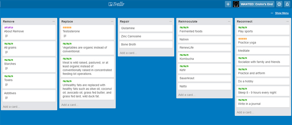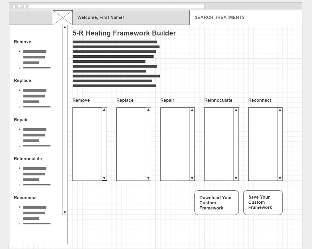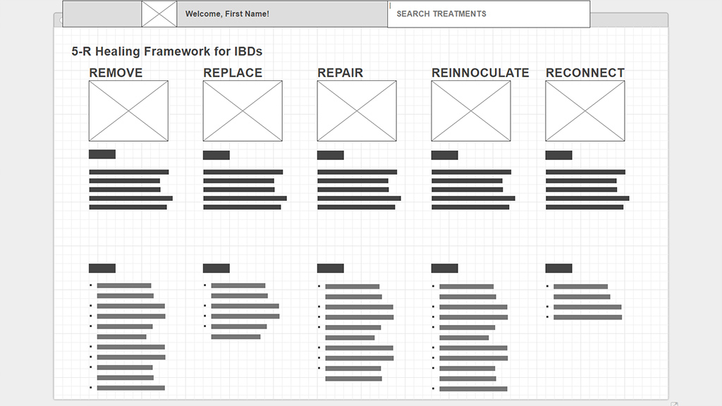 I started by creating a Trello board to visualize quickly if the five components naturally fit within my mental model of five columns with treatments in each one. I then created a wireframe and both helped me imagine what the 5R IBD Framework software could be like.