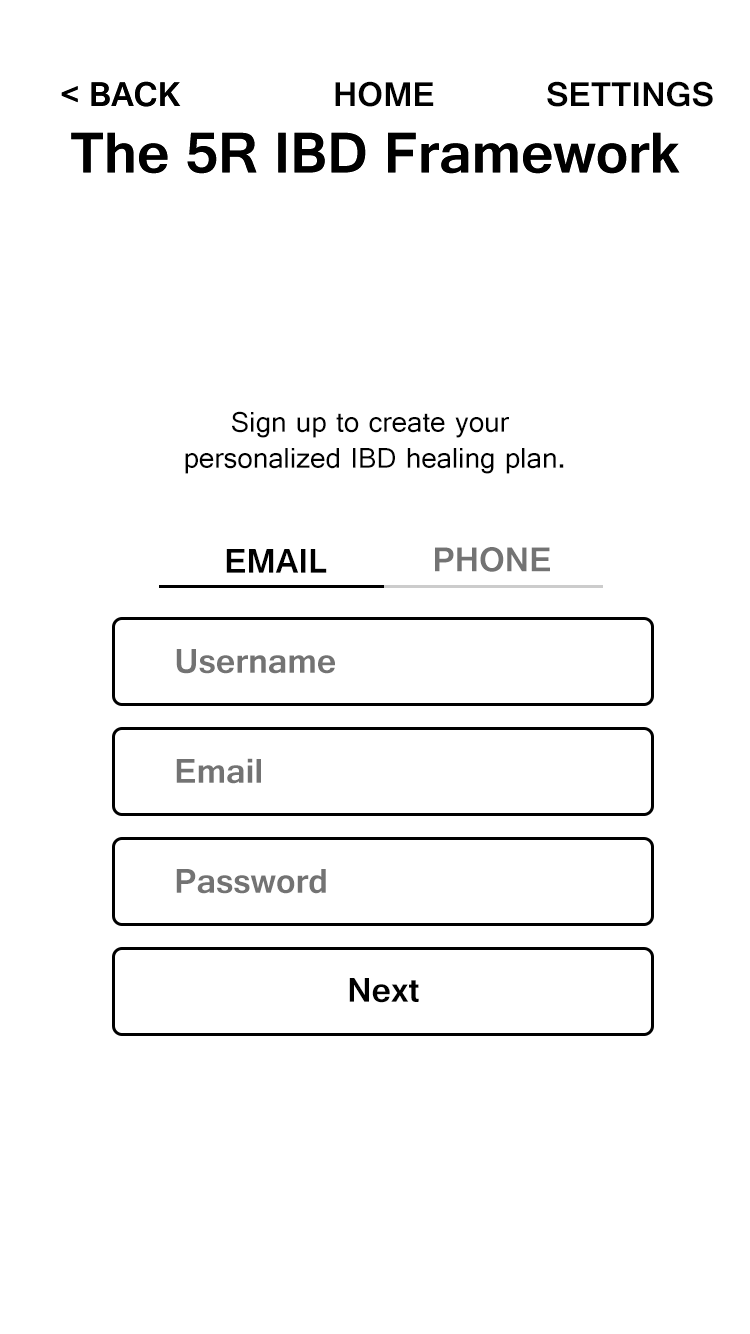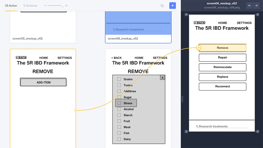 In the interest of time and design, I decided to build a barebones app a patient would use to build their 5R IBD Healing Framework, and do it on a mobile platform. I thought the constraints of creating an app on the mobile platform and which served a limited yet important function would give me the focus I needed to design and iterate quickly.