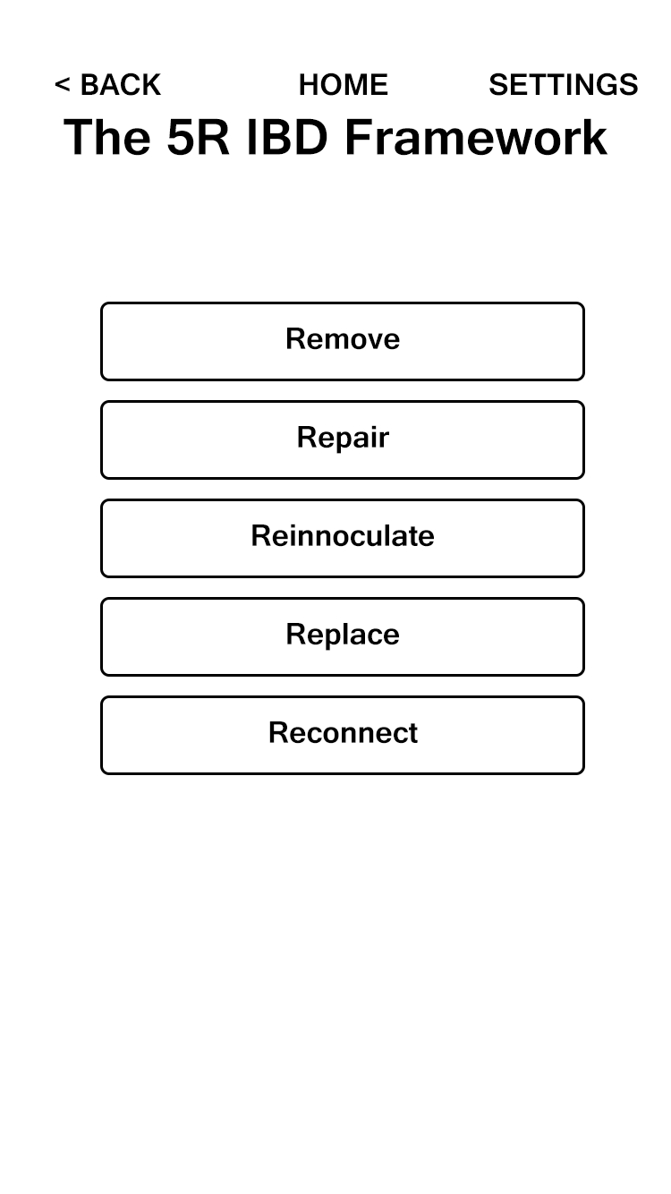 You are welcome to play with the 5R IBD Framework prototype made with Invision. At this point in the app development cycle it is ready for programmers and artists to turn it into a beautiful, fully functioning product that continues to be improved on with each iteration.